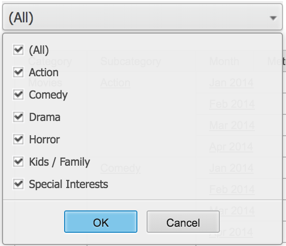 When creating a Report Services Document, you may want to create a drop down selector to save space, but also would like the drop down to be a multi-selector with OK/Apply button. Below are instructions to achieve this in a Report Services Document.