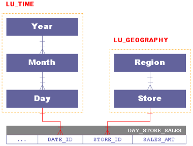 | Explanation | This schema is characterized by one lookup table per dimension, with base tables at the lowest level. This is the fastest way to set up a data warehouse: |