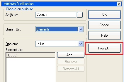 - Create a new filter, select Add an Attribute qualification and choose the highest level attribute Country. Make sure to Qualify On: Elements. Click Prompt as the image shown below. Accept all the default values without any changes in the popped up window after clicking on "Prompt" as shown below. Save the filter as "Country Filter".