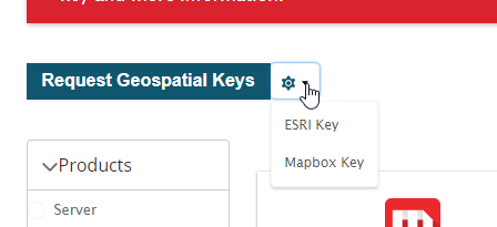 - Locate the Request Geospatial key button above the products session and click on Mapbox Key :