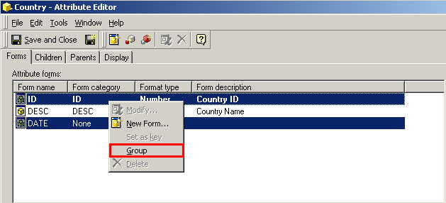 - From the 'Edit' menu, choose 'Group'NOTE: Modifying the key form will trigger required updates when saving. This may make related application objects (reports, filters and metrics) unusable.
